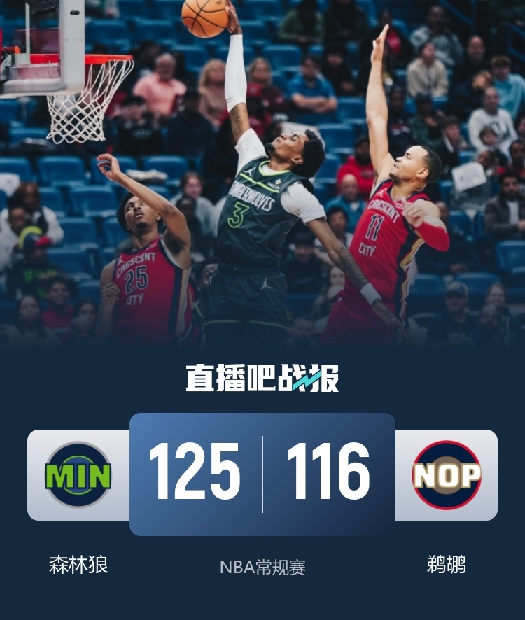 開場后森林狼依靠內線優勢搶占先機,費爾斯外線連中三分幫助鵜鶘追上比分,首節兩隊打得大開大合,森林狼首節尾聲連續拿分再度建立領先。第二節上來森林狼延續攻勢一度將分差拉大到兩位數,不過隨后森林狼自身失誤不斷又被鵜鶘逐漸將比分追上,半場過后兩隊打成平手。易邊再戰,愛德華茲上來2分鐘連吃2個犯規領到個人第4犯只得下場休息。鵜鶘趁勢完成反超,不過蘭德爾帶隊緊咬比分。最后一節森林狼上來轟出15-0的攻勢確立領先,此后鵜鶘努力追分但森林狼掌控局面,最終森林狼125-116力克鵜鶘取得4連勝,鵜鶘遭遇5連敗。